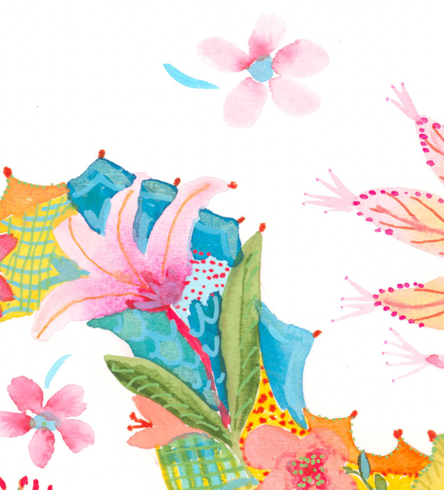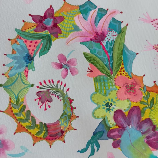 This playful original artwork depicts a mythical dragon joyfully playing among flowers in warm pinks, yellows, and greens. The vibrant colors and lively scene capture a whimsical moment full of charm and delight.