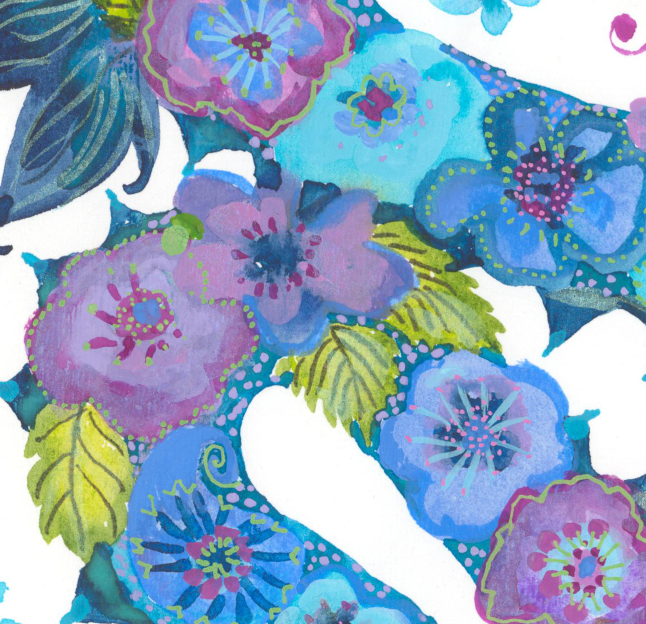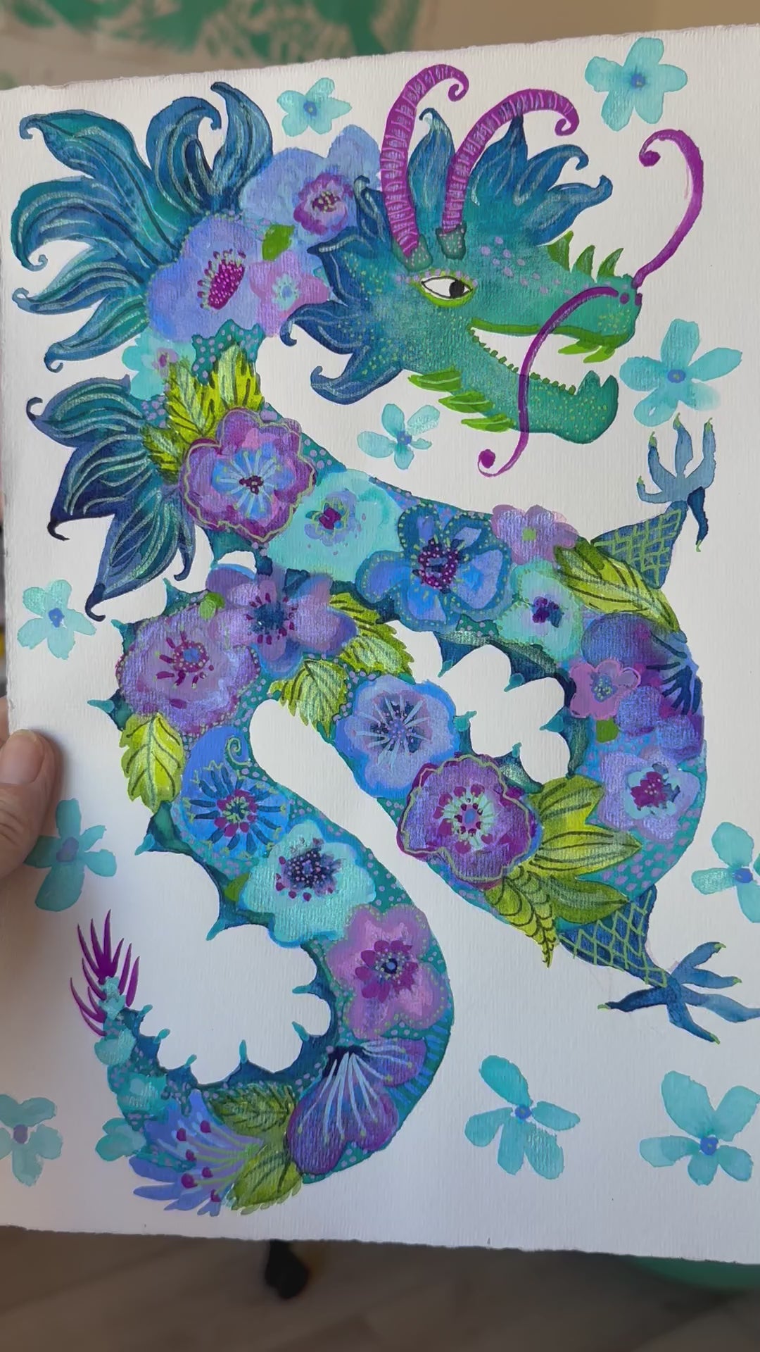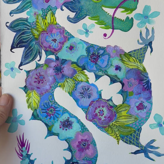 This playful original artwork features a blue dragon dancing joyfully amid frolicking flowers in cool tones. Lime green pen and ink details add a lively contrast.