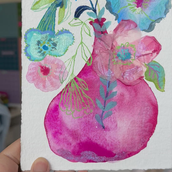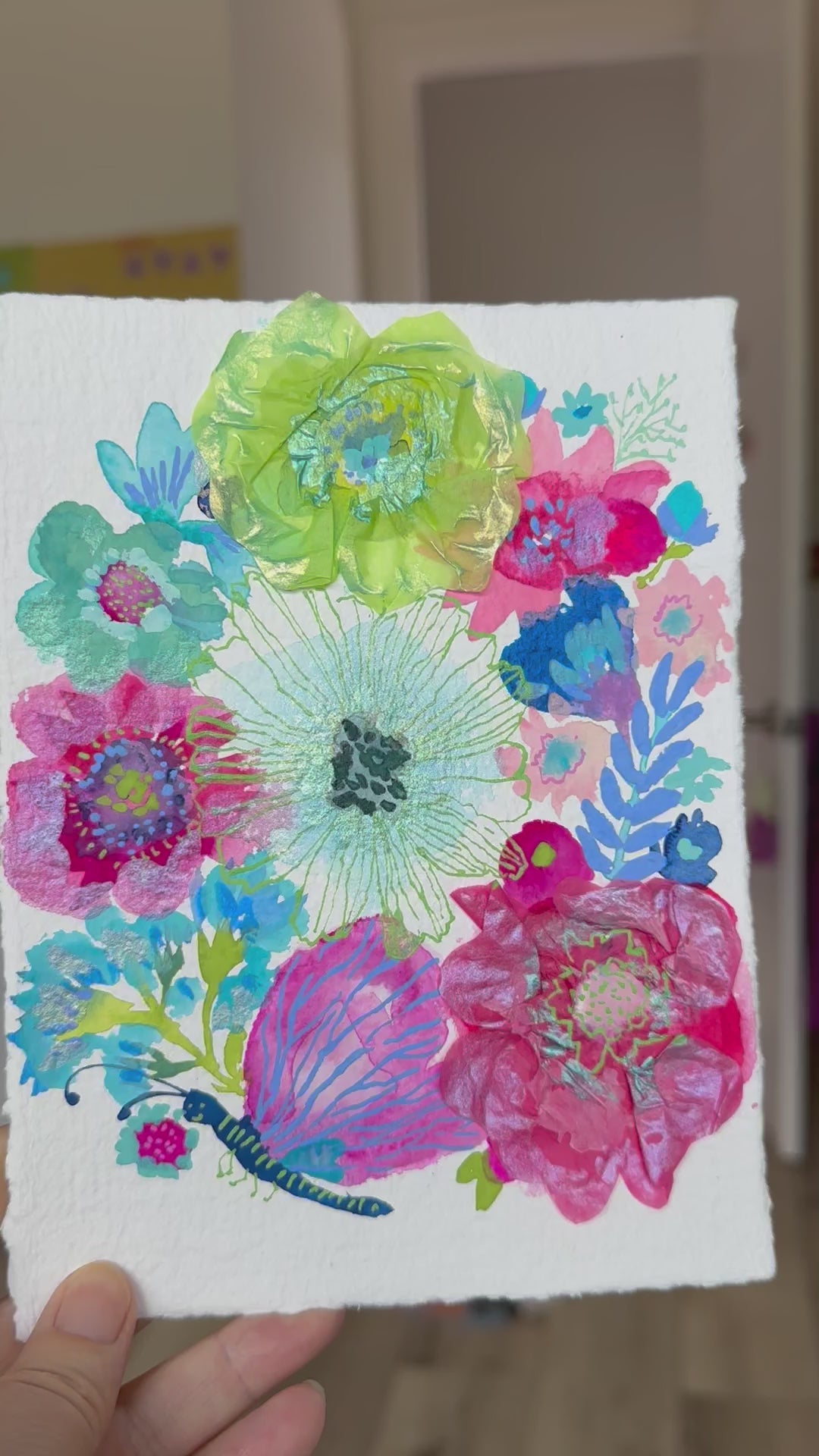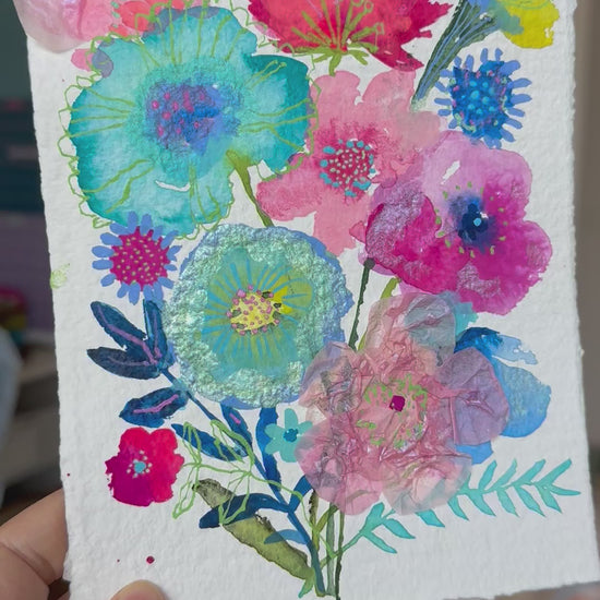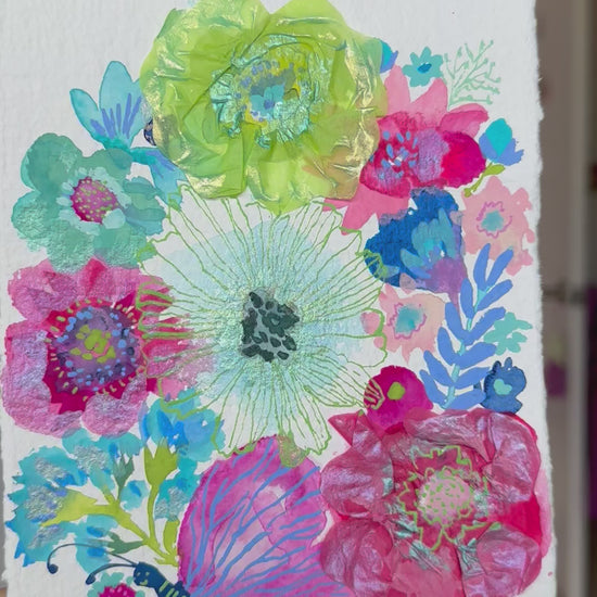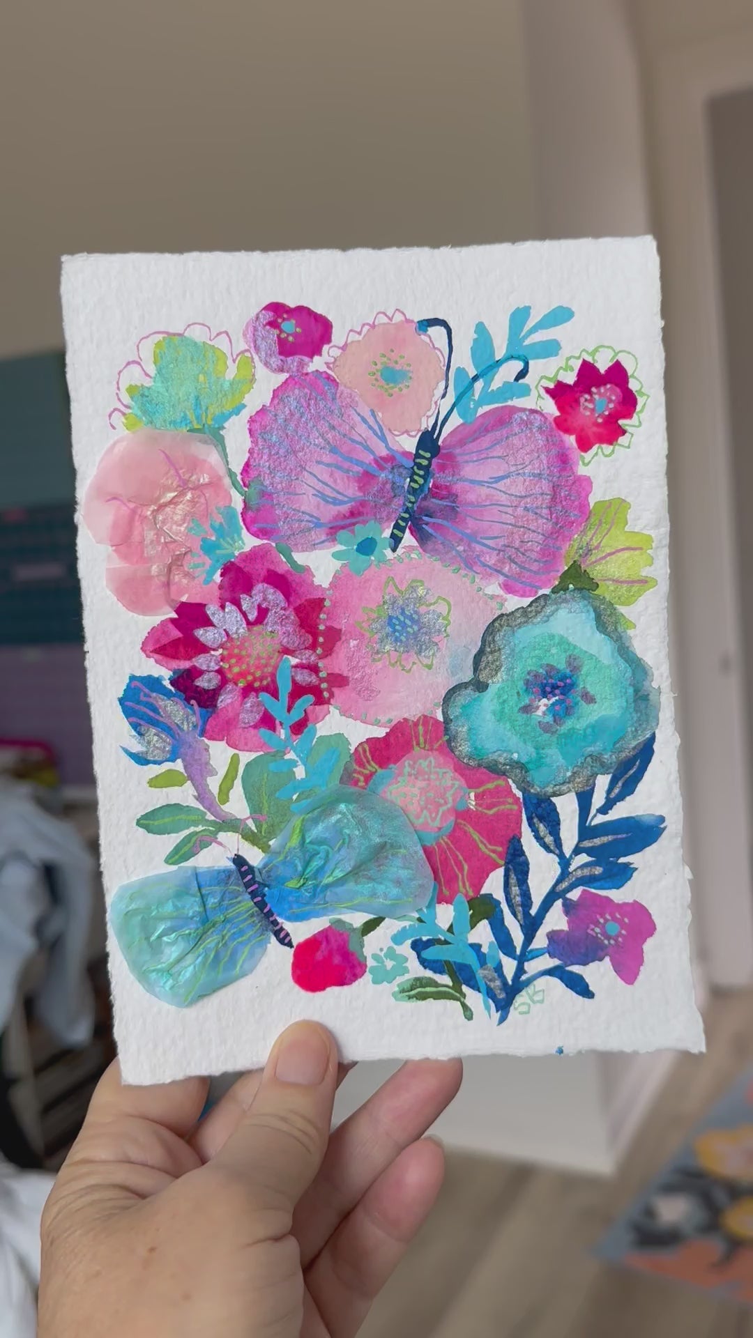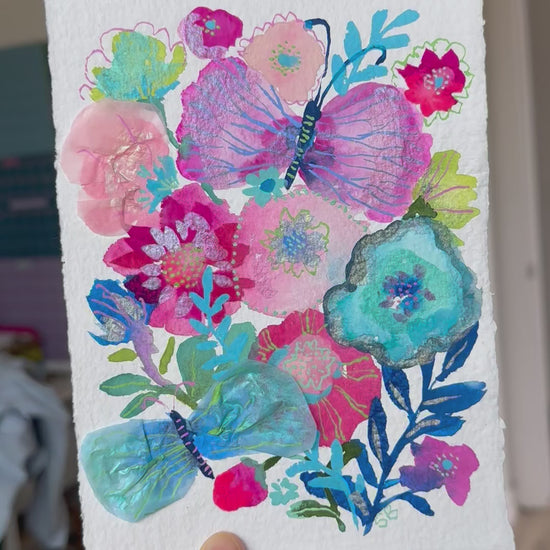 A whimsical set of four hand-painted mini masterpieces. Each piece bursts with fluttering butterflies and blooming flowers in joyful pinks and blues, brought to life on luxurious St. Armands cotton rag paper with charming deckle edges. Layered tissue paper adds texture, while iridescent paints and delicate pen and ink details sparkle with charm.