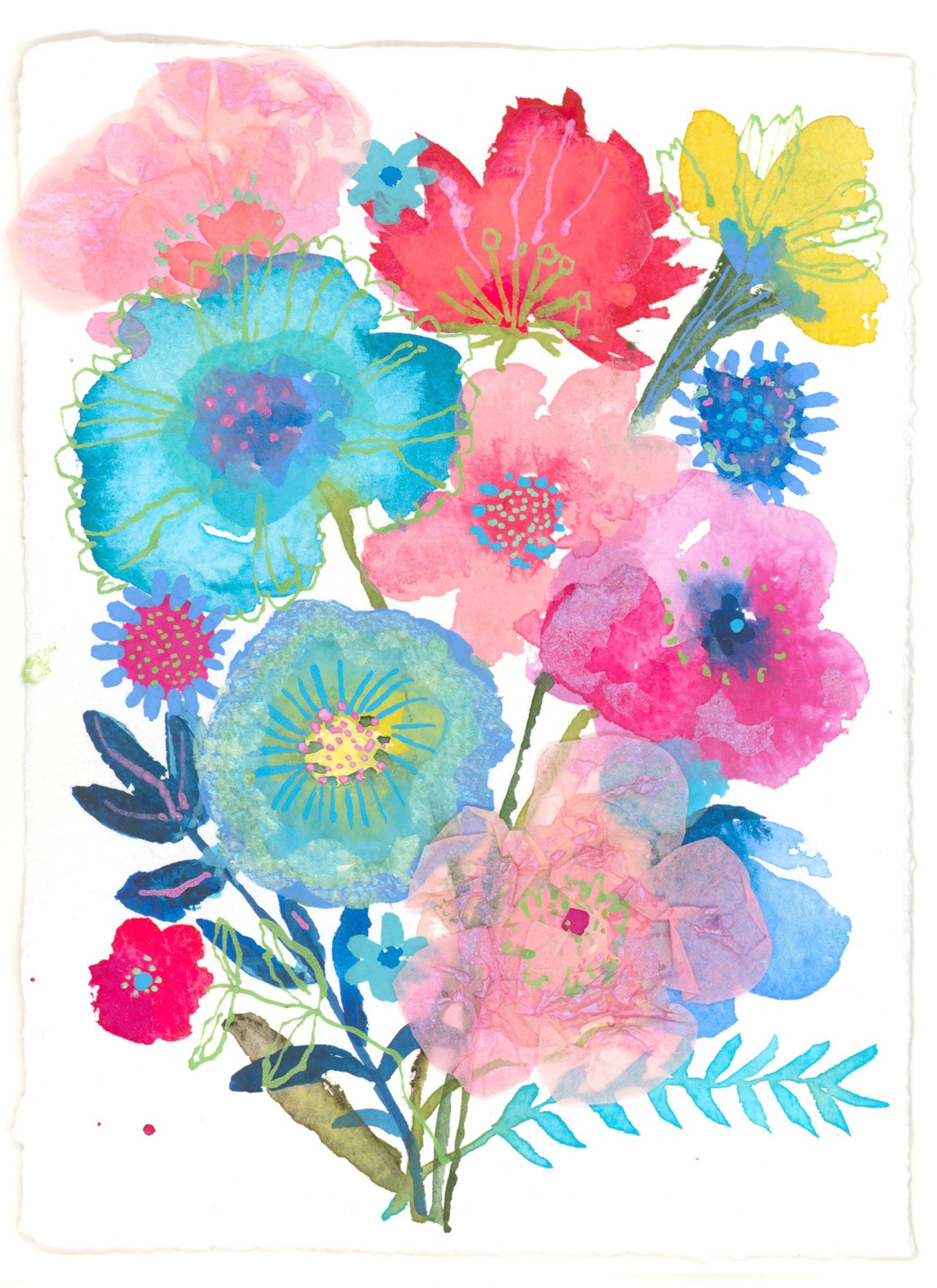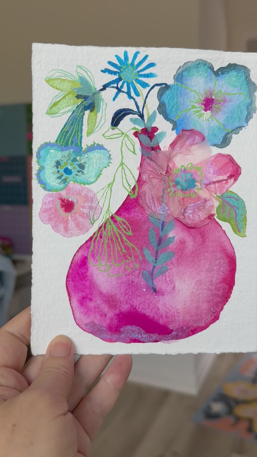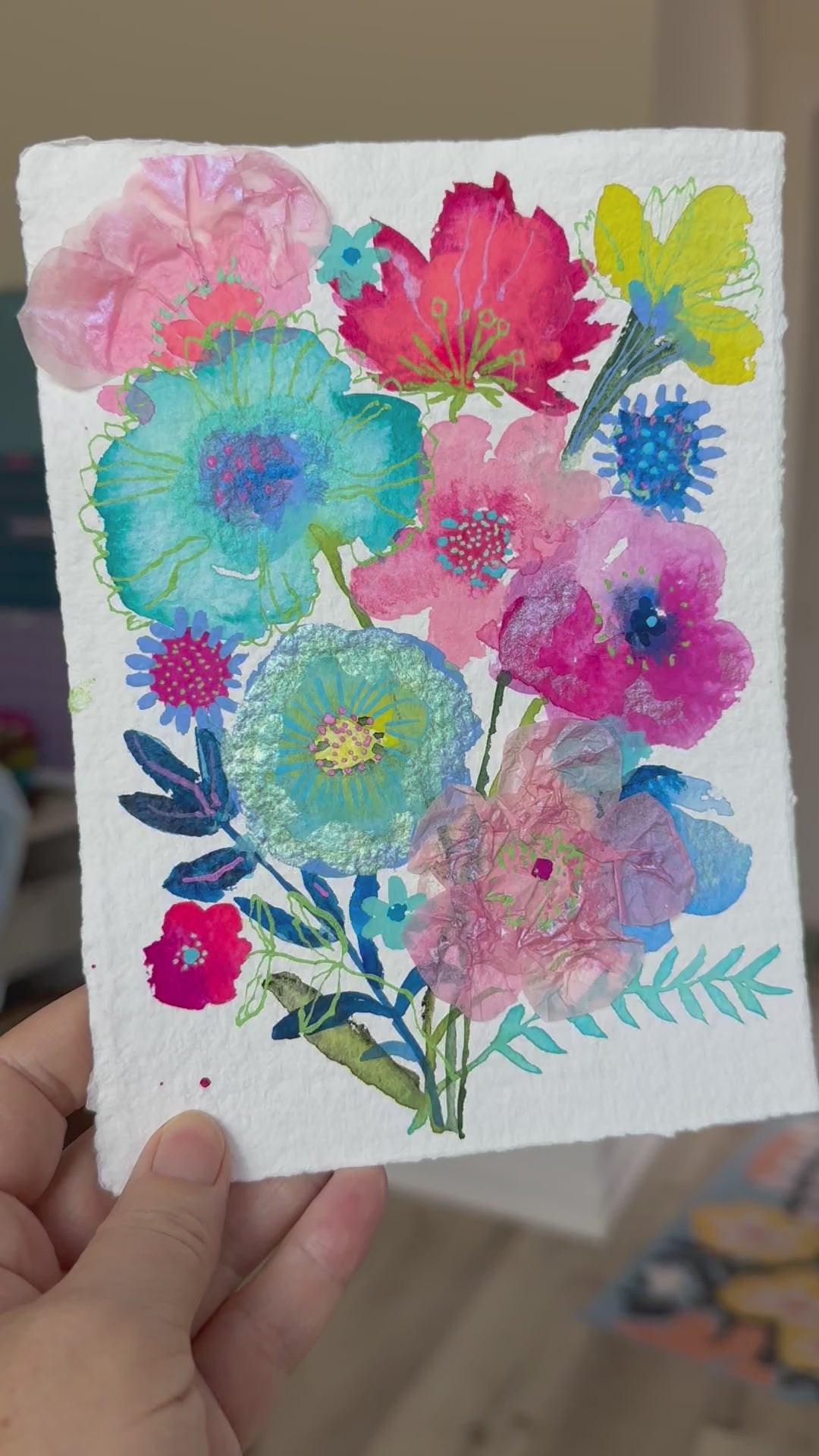 A whimsical set of four hand-painted mini masterpieces. Each piece bursts with fluttering butterflies and blooming flowers in joyful pinks and blues, brought to life on luxurious St. Armands cotton rag paper with charming deckle edges. Layered tissue paper adds texture, while iridescent paints and delicate pen and ink details sparkle with charm.