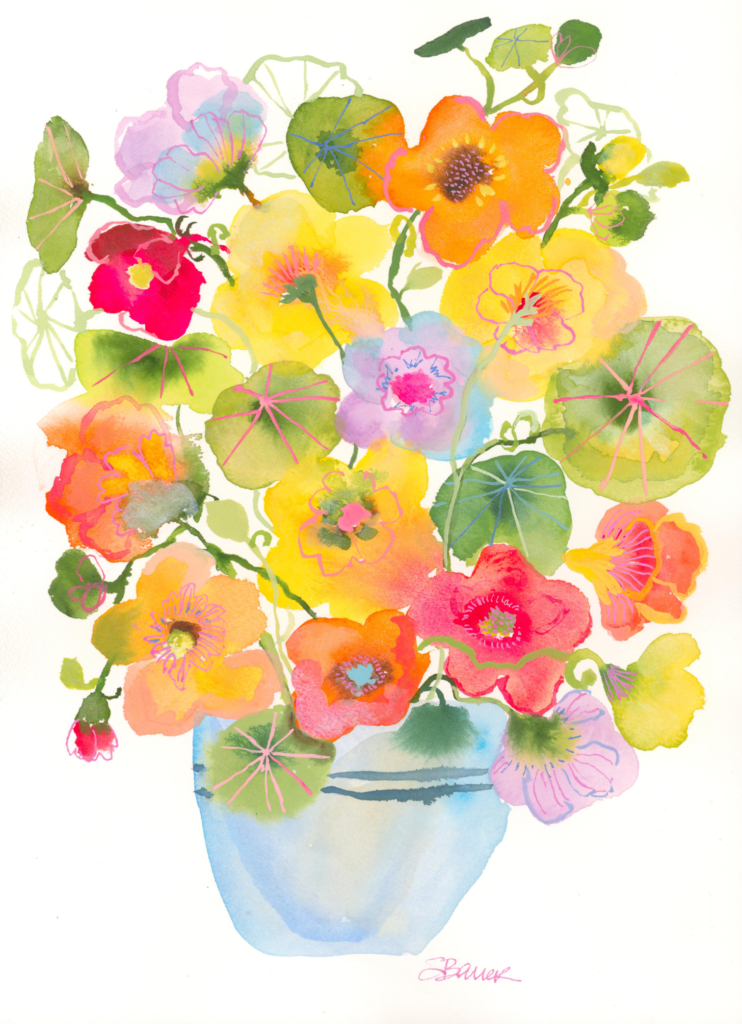 This hand painted original artwork captures the charm of summers nasturtiums with yellows, oranges, and deep pinks. Playful leaves and flowers twirl and burst joyfully from a white and blue striped pot.