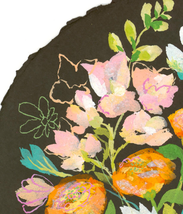 You tell just how much Snapdragons love Freesia in this stunning gouache original artwork, blooming on a black, hand-made 100% cotton rag paper circle. Pen and Ink detail along with iridescent washes make this jewel sparkle!